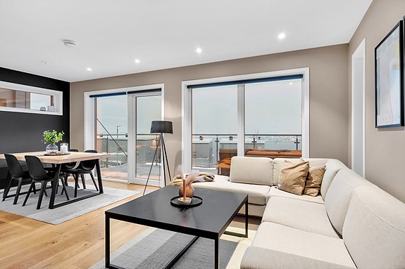 Boligen byr på innbydende stue med god takhøyde, store vindusflater og nydelig utsikt. Kjøkkenet finner du like ved, med integrerte hvitevarer og rikelig med skap- og arbeidsplass. Den åpne løsningen mellom stue og kjøkken sikrer en luftig og sosial atmosfære, samt gode møbleringsmuligheter. Videre byr boligen på to soverom av god størrelse, et lekkert komplett flislagt bad med moderne innredninger, et praktisk vaskerom, og en flott entré med gulvvarme. Stor og attraktiv, vestvendt balkong med utgang fra stue, med nydelig utsikt og svært gode solforhold!