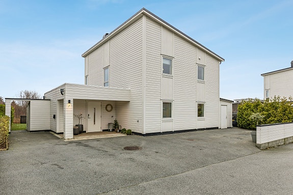 Fra uteplassen er det lett kontakt med oppholdsrommene inne, og hagen danner en lun ramme rundt boligen. Med en kombinasjon av lyse flater og gjennomført materialvalg fremstår huset som moderne og tidløst - et hjem som er like godt tilpasset sosiale sammenkomster som rolige hverdager.