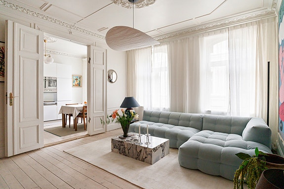 - Stukkatur, rosett, originalt gulv og doble fløydører