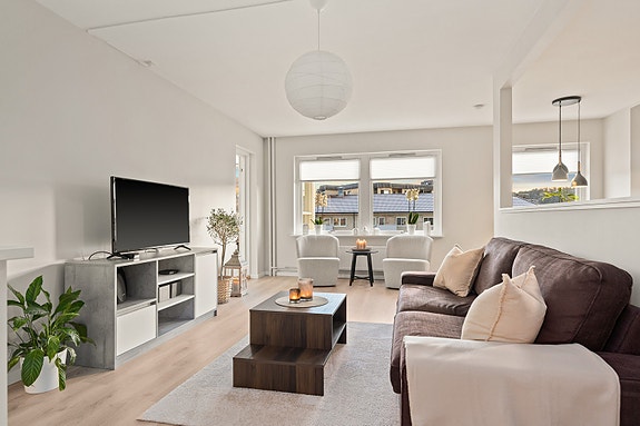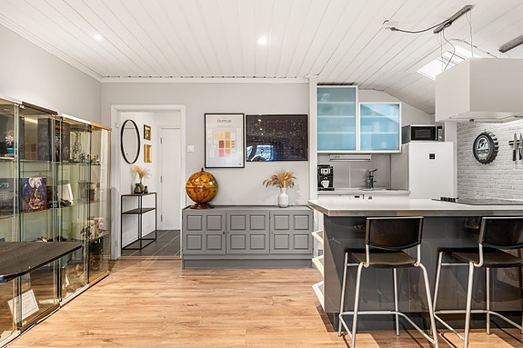 Gjennomgående nyere laminatgulv med lav slitasje binder rommene sammen på en helhetlig måte.
