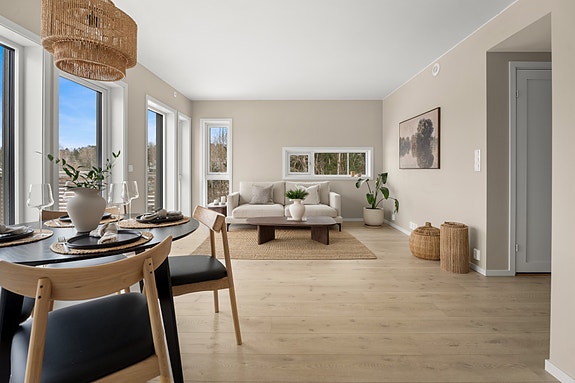 Leiligheten fremstår med duse, delikate fargevalg, balansert ventilasjon og praktisk planløsning. Stuen og kjøkkenet danner et åpent, luftig allrom med møbleringsfrihet, og kjøkkenet har integrerte hvitevarer. Videre er det et helfliset bad, et eget vaskerom, to pene soverom og en entré med gulvvarme. Ett rom har garderobeløsning, og lagringsplass finnes i en disponibel utebod på ca. 6 kvm.