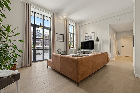 Leiligheten har flislagt hall, innvendig bod, toalettrom, 2 soverom og stue/kjøkken i åpen løsning med Sigdal-innredning, 1-stavs parkett og luftig romfølelse. Badet har flislagt gulv, malte vegger, flislagt dusjnisje og innredning fra Sigdal. Vestvendt terrasse på 29m² med gode solforhold og kveldssol. Andelen disponerer en P-plass med billader. En sjelden leilighet med både historie, sjarm og særpreg. IN-ordning for hoveddel av fellesgjeld.