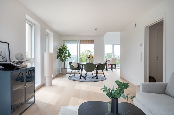 Dette er en lys og moderne toppleilighet! Leiligheten er ny og ubebodd og fremstår i god stand. Den er over to plan, men du kan fint bo kun i "hovedetasjen" og la den øverste etasjen med loftstue, soverom og bad være for besøkende gjester. Dette er en solrik leilighet med egen vestvendt takterrasse, i tillegg til to andre balkonger. Det medfølger parkeringsplass i kjelleren og sportsbod. Her bor du komfortabelt med gulvvarme og balansert ventilasjon som gir et godt inneklima. Det er heis i bygget.