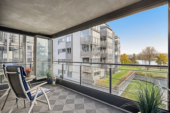 Stor innglasset balkong med nydelig utsikt mot elva.