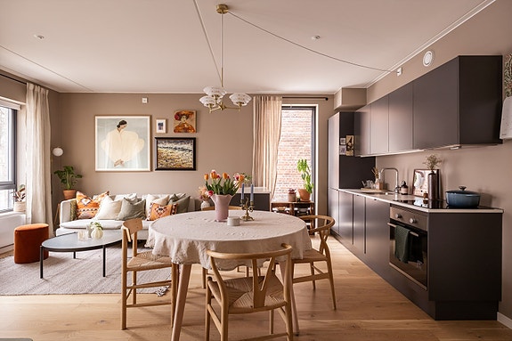 - Innbydende og romslig stue- og kjøkkenløsning med plass til både sofahjørne og spisegruppe