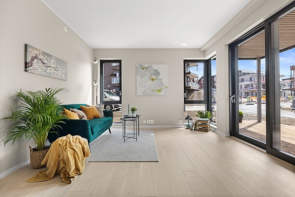 Innbydende 3-r hjørneleil | moderne løsninger | bygg fra 2024 | 17 kvm overbygget markterrasse | meget hyggelig nabolag