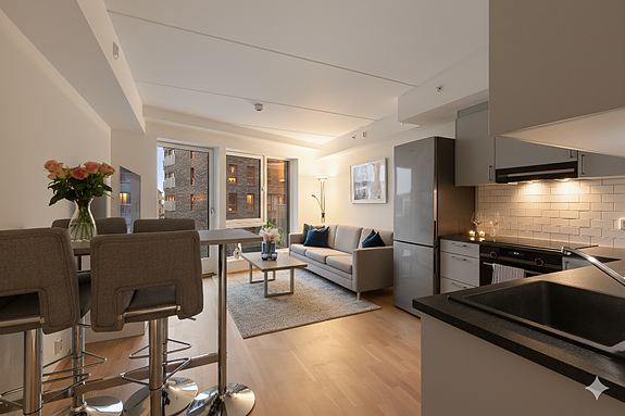 Urban og sentral 2r fra -19 m/balkong og vannbåren gulvvarme. Nyt kvelden på felles takterrasse m/utsikt utover fjorden
