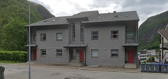 Velkommen til Skyttarplassen 3B! Leiligheten befinner seg i øverste halvdel til høyre.