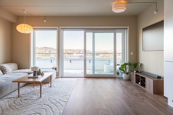 Toppleilighet med flott fjordutsikt og fantastiske solforhold. Garasjeplass. Balkong på 18 kvm. Fjernvarme. Heis.