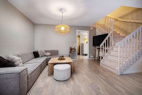 Velkommen til en ny og flott bolig over 2 etg. Stuen er romslig med plass til sofa og øvrig møblement.