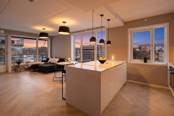 Benjamin Ådna v/ Nordvik har gleden av å presentere Sørkedalsveien 9E- En lekker hjørneleilighet beliggende i byggets 6. etasje. Foto: Henrik Sporsheim v/ Tigerstaden Boligfoto AS.
