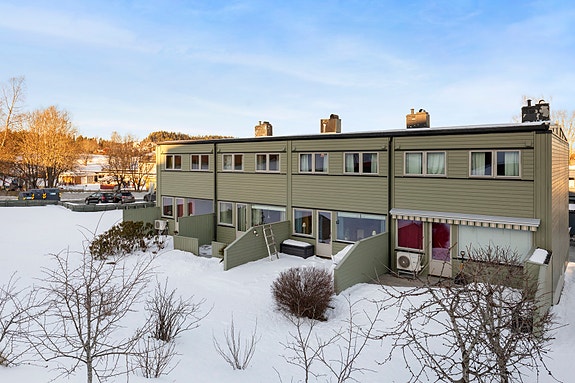 PENT & INNHOLDSRIKT REKKEHUS MED EN AV DE BEDRE BELIGGENHETENE. Skjermet og solrikt. Bad 2022. Vaskerom 2023. Carport.