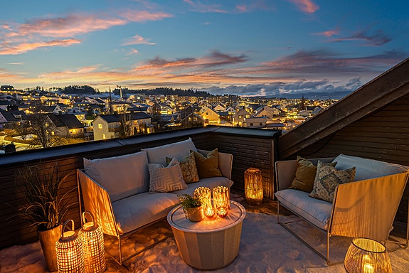 Et høydepunkt med boligen er takterrassen på hele 21,5 kvm. Her sitter man helt skjermet, med sol fra morgen til kveld, samt uhindret utsikt.