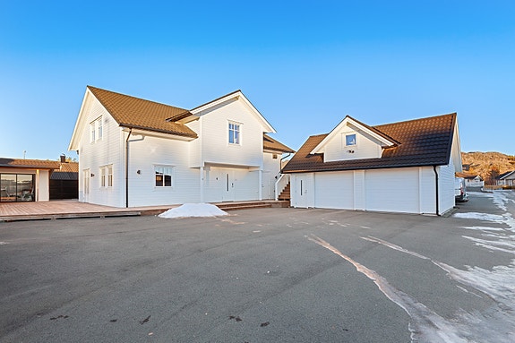 På eiendommen er det også oppført en dobbelgarasje på 45 kvm pluss hems. Garasjen er fullisolert og har bl.a. installert egen varmepumpe, EL-billader og løftebukk. I tillegg er det oppført en hagestue, terrasser og utvendig bod.