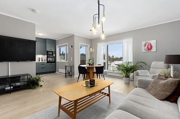 Inneholder lys og åpen stue/kjøkkenløsning med påkostet kjøkken, 2 gode soverom, lekkert flislagt bad, vaskerom/ teknisk og romslig entre m/varmekabler.