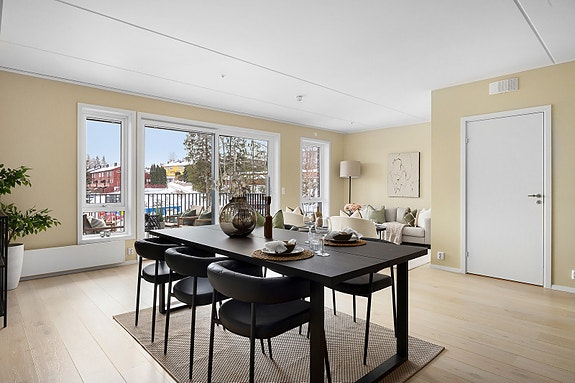 Boligens beliggenhet er nære både byliv og natur, med kort vei til marka, samt et bredt utvalg av butikker og spisesteder. Offentlig transport er lett tilgjengelig med buss og tog i nærheten.