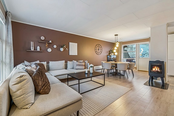 Her får du et innholdsrikt og oppgradert rekkehus med en god planløsning. Boligen har en gjennomgående pen standard, og fremstår moderne. Boligen går over to plan og har blant annet romslig stue med vedovn, tidløst kjøkken og 2 soverom. Videre har du bad i innbydende utførelse, separat vaskerom og toalettrom, 2 soverom og godt med lagringsplass.