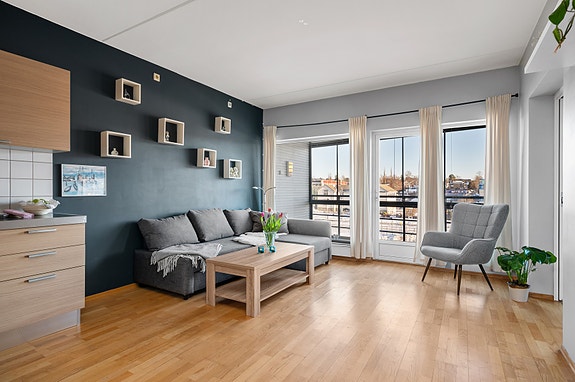 - Lys og trivelig stue med god takhøyde og utgang til innglasset balkong