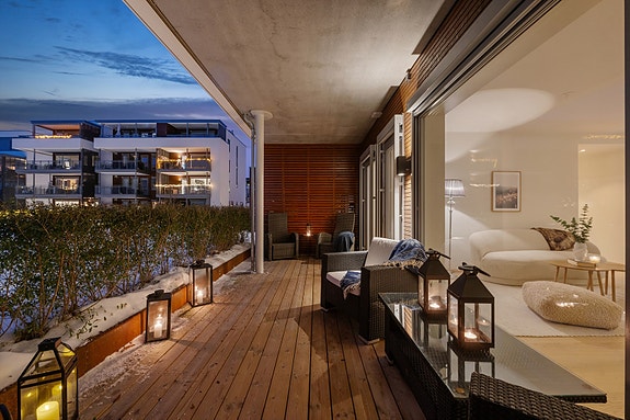 Flott 3-roms leili. på bakkeplan ved sjøen. Stor terrasse. Heis. Vannbåren varme. Garasjeplass. IN- ordning. Takterrasse