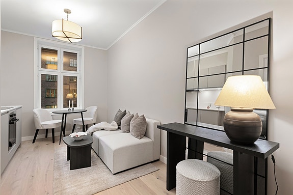 Leiligheten ligger i 3. etasje og er pusset opp med stilrene material- og fargevalg, og eksklusive uttrykk både i leilighetene og i fellesarealer. Effektive planløsninger gir arealutnyttelse som gjør leilighetene både lyse og luftige. Den frodige bakgården byr på sittegrupper, beplantning og pizzaovn - et sosialt og innbydende uterom.