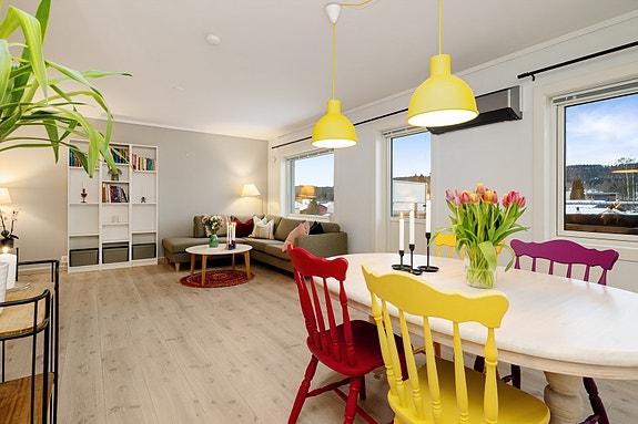 Ny varmepumpe i stue i 2022, med utført service i 2025.