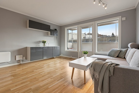 Lys og moderne 2-roms med innglasset balkong på 10 m² | Garasjeplass i lukket anlegg | Heis | Vinduer fra 25 | Sentralt