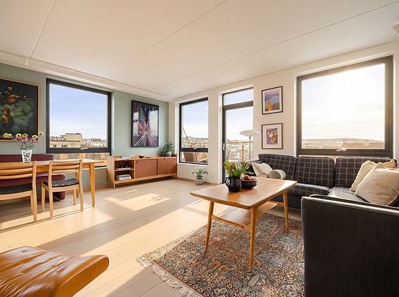 Velkommen til denne fantastiske leiligheten i populære Tigergården! Foto: Alexander Granlie | @boliggram. (Sollys i bildet er KI-generert og ment som illustrasjon).