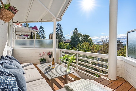 Solrik 3-roms toppleilighet med vestvendt balkong, fantastisk utsikt og fyring inkl. - rolig beliggenhet!