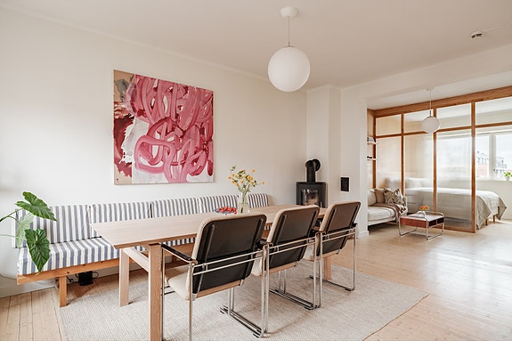 Mesteparten av leiligheten har blitt pusset opp siden 2019. Selger har lagt spesielt vekt på å lage et hjem som oppleves varmt, hyggelig, arkitektonisk riktig, og med fokus på kvalitet i materialvalg. Det er blant annet laget en spesiallaget glassvegg med rilleglass, detaljer i eik, slipt originale tregulv, nyere peisovn og stilrent kjøkken med detaljer i stål.
