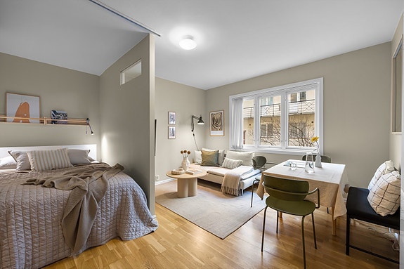 Pen og arealeffektiv 1-roms med sovealkove. Fyring og varmtvann inkludert. God planløsning. Perfekt førstegangskjøp!