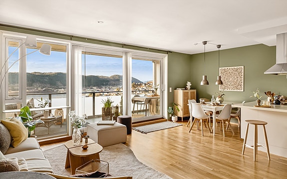 Stor, svært funksjonell 4-roms leilighet med ekstra stue, to bad, solrik altan, garasje og carport. Foto: BARK Foto v/Terje Arntsen