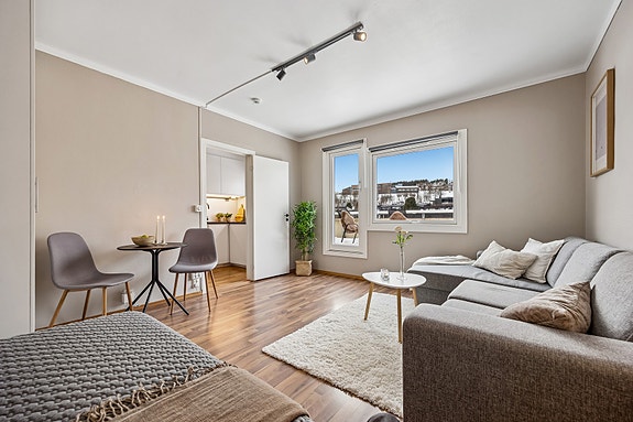 Arealeffektiv topp- og hjørneleilighet | Terrasse på 45 kvm | Perfekt førstegangskjøp | Flotte sol- og utsiktsforhold!