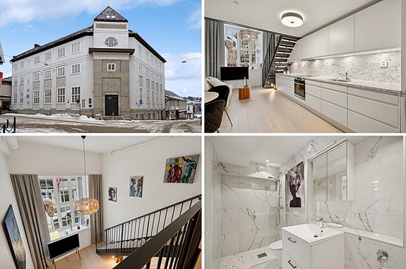 Leiligheten har spennende planløsning og består av entré, rålekkert bad med marmorfliser, stue og påkostet kjøkken i åpen løsning og med trapp til mesanin med flere bruks- og innredningsmuligheter.