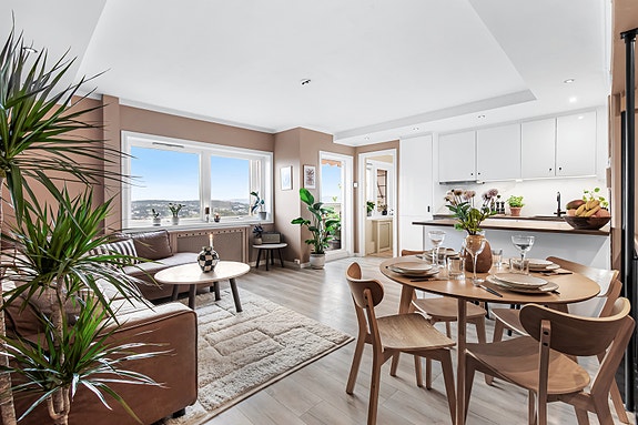 Moderne og attraktiv 4-roms, plassert i bygningens 8. og 9. etasje. Leiligheten har en gjennomgående god standard over to plan, med en praktisk planløsning som inkluderer tre soverom, bad fra 2020, stue med åpen kjøkkenløsning og en entré/gang. Stuen har utgang til en vestvendt innglasset balkong på ca. 5 kvm, som gir mulighet for å nyte utsikten og ettermiddagssolen. Kjøkkenet er oppgradert med moderne innredning fra 2018. Varmtvann og fyring er inkl. i felleskostnadene. For ekstra oppbevaring har du lagring i disponibel bod på ca. 3,3 kvm.