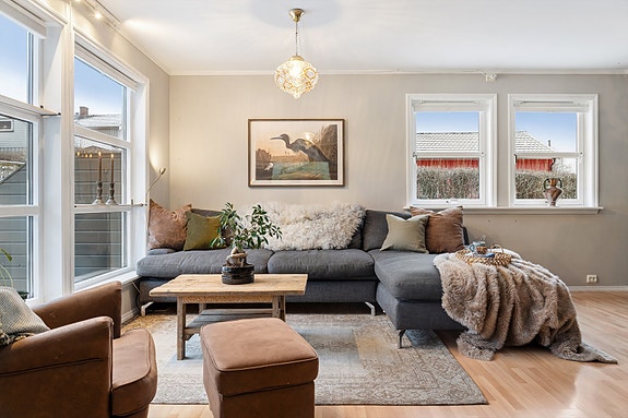 - Lys stue med god plass til sofagruppe, spisestue og lesekrok.
