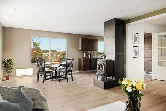 - Varmepumpe og vedovn i stue