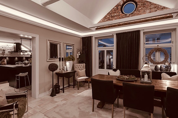 Særdeles tiltalende stue med åpen himling (4,5 m takhøyde).
