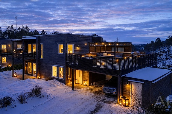 Tidsriktig funkisbolig med havutsikt - takterrasse - dobbel carport - 2 stuer - 2 bad - barnevennlig