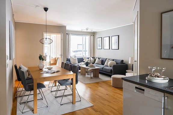 . Innholdsrik leilighet med tre soverom og åpen stue-/kjøkkenløsning sentrert i boligen.