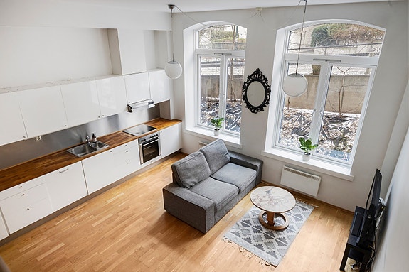 Romslig og lys fabrikkleilighet over 2 plan | Hems på 8 kvm | Garasje | Store vindusflater | 2 soverom | Sentrumsnært!