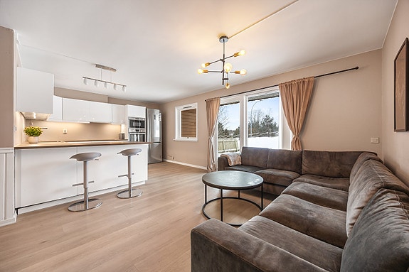 Leiligheten ligger i første etasje og har en åpen og sosial planløsning mellom stue og kjøkken, samt to hyggelige soverom og et bad som ble pusset opp i 2019. Fra stuen er det utgang til en stor terrasse som blir en flott forlengelse av boligen. Dette er et perfekt hjem for deg som verdsetter nærhet til både natur og byens fasiliteter. Området er ypperlig for barnefamilier, da det er både barnehager og skoler i alle trinn innen kort avstand.