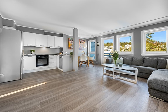 Leiligheten inneholder 3 soverom av god størrelse, 2 bad og åpen kjøkken/stueløsning. Beliggenheten på enden gir ekstra dagslys og vidstrakt utsikt gjennom vinduene på endeveggen.