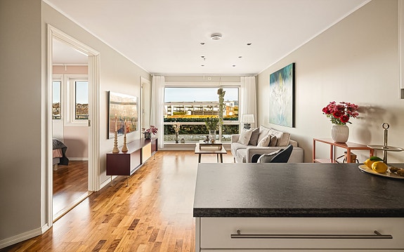 Apeltun | Flott 2roms leilighet med utsikt. Sol fra 17-23. IN-ordning. Garasjeplass/el-bil lader. Ingen forkjøpsrett.