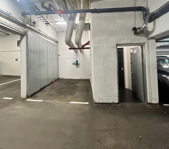 Adkomst til garasjen går via port som åpnes ved kodebrikke, telefon eller adgangskort.