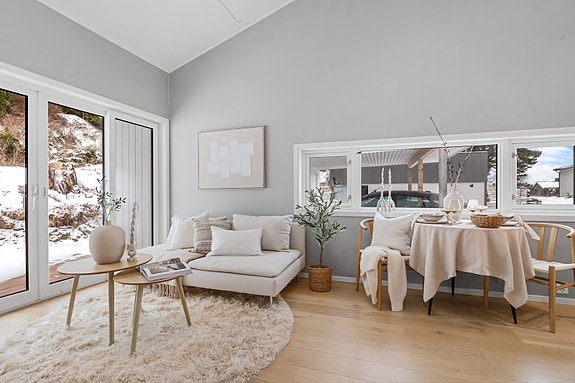 Meget lys og hyggelig stue- legg merke til høyden under taket