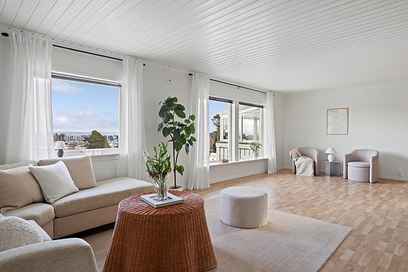 Velkommen til Øvre Bogenvei 45 - en lys, pen og romslig halvpart av en horisontaldelt tomannsbolig. Boarealene er fordelt over 1. og 2. etasje, i tillegg til kjellerbod på ca. 14 kvm. Her bor du i rolige og idylliske omgivelser, nær skoler, båthavn, badstrand og dagligvarebutikker. Boligen har gode solforhold og fine uteplasser med innglasset veranda, skjermet terrasse og overbygget balkong.