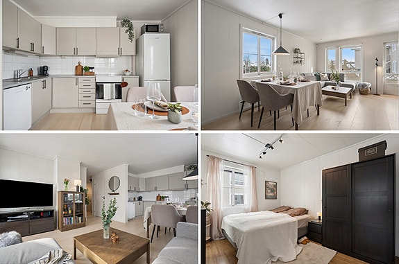 Badet har fliser på både gulv og vegger, og fremstår ryddig og funksjonelt. Kjøkkenet har slette fronter og gode arbeidsflater. Fra stuen er det utgang til praktisk og koselig uteplass som gir rom for både avslapning og små sosiale stunder. Leiligheten har også utebod og parkering.