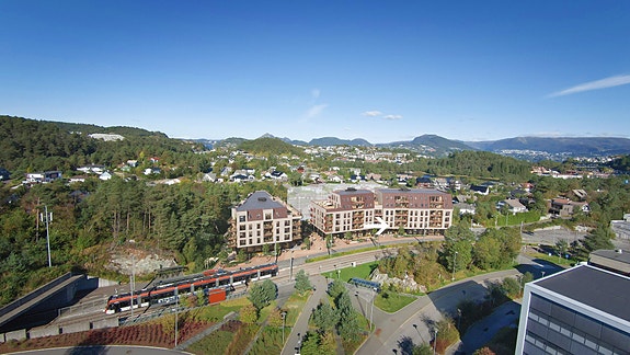 Bybanestoppet på Sandslimarka ligger rett utenfor døren, og det etableres dagligvarebutikk (Coop) i byggets 1. etasje.
