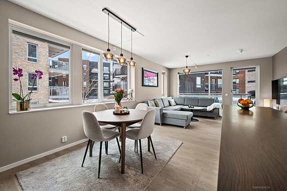 Leiligheten har en moderne standard. Leiligheten har utgang til en 10 kvm balkong. Ellers kan man vente seg en stue/spisestue med godt lysinnslipp, åpent kjøkken, delikat bad og to gode soverom. Garasjeplass med elbil-lader og bod medfølger.