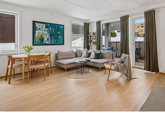 Leiligheten har en åpen og innbydende stue- og kjøkkenløsning med direkte utgang til en trivelig og solrik markterrasse. Her kan du nyte gode lysforhold og sol helt frem til ca. kl. 21.00 på sommerstid.